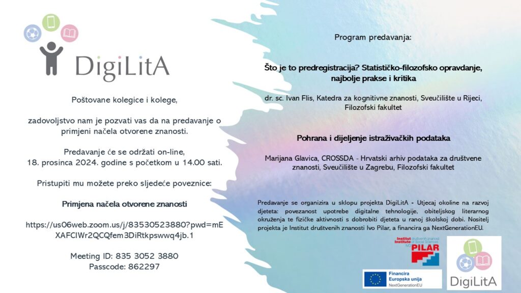 Projekt Instituta Pilar DigiLitA – Utjecaj okoline na razvoj djeteta organizirao je predavanje PRIMJENA NAČELA OTVORENE ZNANOSTI koje se održalo on-line 18. prosinca 2024. Na programu su bile teme Što je to predregistracija? Statističko-filozofsko opravdanje, najbolje prakse i kritika (dr. sc. Ivan Flis) te Pohrana i dijeljenje istraživačkih podataka (Marijana Glavica). Zahvaljujući ljubaznosti dr. sc. Ivana Flisa, njegovu prezentaciju donosimo u cijelosti.