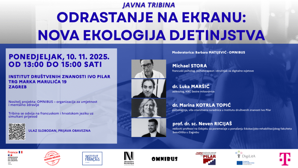 U ponedjeljak, 10. studenoga 2025. u Institutu društvenih znanosti Ivo Pilar održana je javna tribina “Odrastanje na ekranu: Nova ekologija djetinjstva”. Organizator tribine je OMNIBUS – organizacija za umjetnost i metalno zdravlje, uz podršku Francuskog veleposlanstva u Hrvatskoj, Francuskog instituta u Hrvatskoj, Grada Zagreba, Zaklade Kultura nova i Instituta društvenih znanosti Ivo Pilar. Tribinom se nastojao potaknuti konstruktivan dijalog između stručne i šire javnosti o načinima na koje društvo može odgovorno i kreativno odgovoriti na izazove digitalnog odrastanja. Na tribini je, ispred Instituta Pilar, sudjelovala dr. sc. Marina Kotrla Topić, voditeljica projekta DigiLitA – utjecaj okoline na razvoj djeteta. Sudjelovali su i  Michaël Stora – francuski psiholog, psihoanalitičar i pionir rada s mladima ovisnima o videoigrama, dr. Luka Maršić – adiktolog iz KBC-a Sestre milosrdnice i jedan od pokretača Kluba ovisnika o kocki te prof. dr. sc. Neven Ricijaš – redoviti profesor na Edukacijsko-rehabilitacijskom fakultetu Sveučilišta u Zagrebu, specijaliziran za rizična ponašanja djece i mladih, maloljetničku delinkvenciju i bihevioralne ovisnosti. Namjera tribine bila je otvoriti prostor za razmjenu iskustava između znanstvenika, praktičara, roditelja i institucija te zajedno promišljati moguće smjernice za očuvanje mentalnog zdravlja i razvoj digitalne pismenosti djece i mladih u 21. stoljeću.